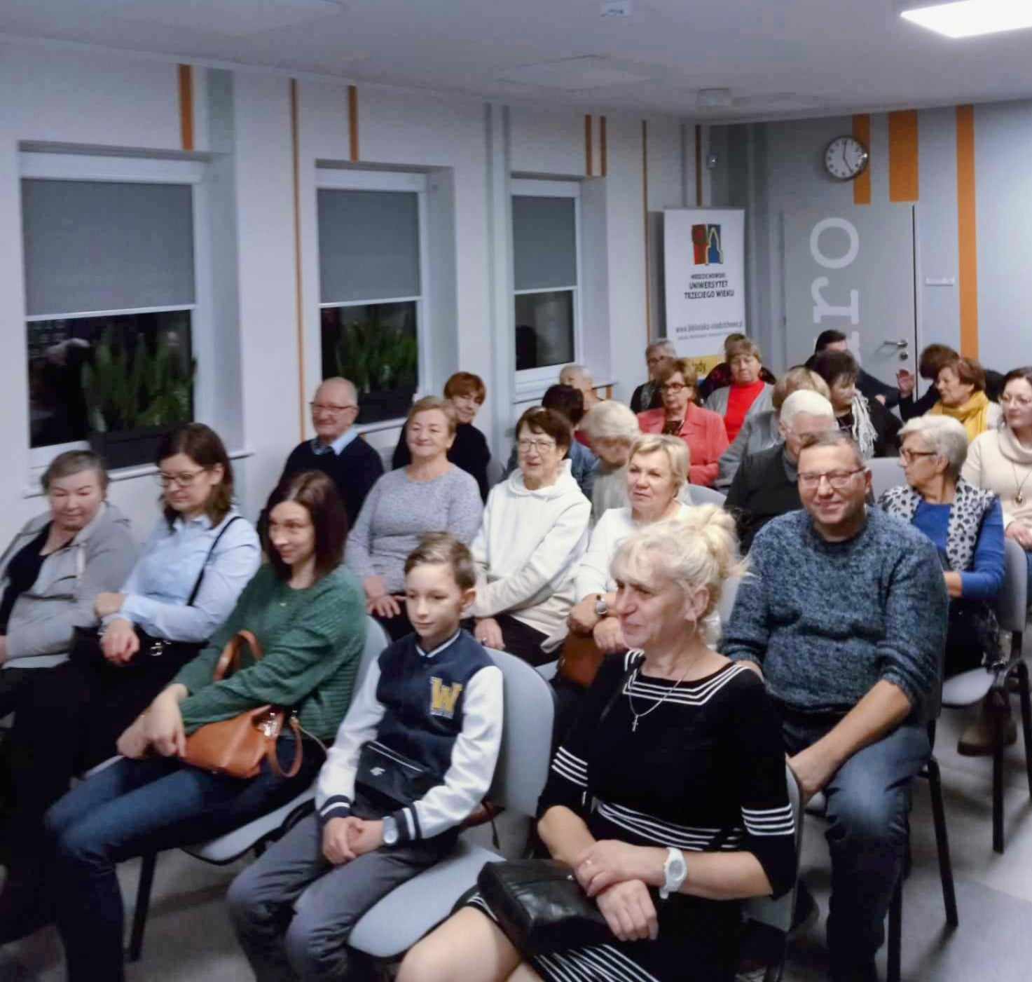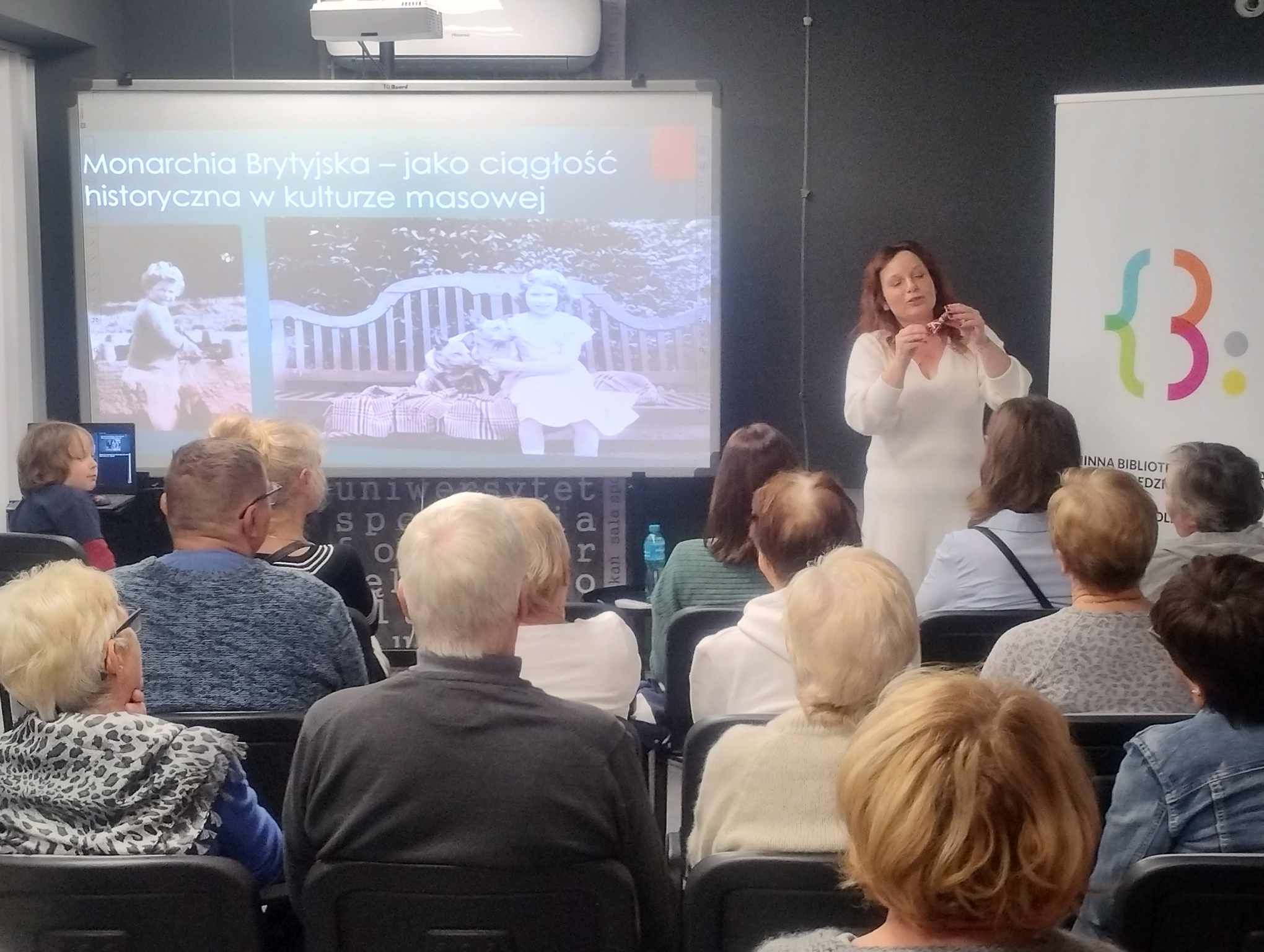 Gość i autor prelekcji prof. UAM dr hab. Daria Hejwosz-Gromkowska przybliżyła licznie przybyłym słuchaczom postać Królowej Elżbiety II oraz interesujące fakty dotyczące rodziny królewskiej. Królowa Elżbieta II była królową Zjednoczonego Królestwa Wielkiej Brytanii i Irlandii Północnej. Tytuł królewski przyjęła w 1952 r., po śmierci ojca i panowała przez ponad 70 lat, aż do swojej śmierci 8 września 2022 r., co czyni ją najdłużej panującą monarchinią w historii Wielkiej Brytanii. Była także jedyną kobietą w rodzinie królewskiej, która wstąpiła do sił zbrojnych i służyła podczas II wojny światowej. Jak podkreśliła prelegentka – Elżbieta II pomimo tak ważnego stanowiska jakie piastowała przez ponad 70 lat, a także członkowie rodziny królewskiej byli mocno obecni w popkulturze. Sama Elżbieta już w wieku 3 lat pojawiła się na okładce magazynu „Time”. Była bohaterką piosenki „Her Majesty” Paula McCartney’a, która znalazła się na ostatnim albumie The Beatles. W 2012 roku, na potrzeby ceremonii otarcia igrzysk olimpijskich w Londynie, królowa Elżbieta II zgodziła się zagrać w krótkim materiale filmowym wraz z kinowym Jamesem Bondem, w rolę którego wcielił się aktor Daniel Craig. Udawali, że skoczyli ze spadochronami na stadion. W czerwcu 2002 roku Elżbieta II nieoczekiwanie pojawiła się przed koncertem, który w ramach obchodów jej Platynowego Jubileuszu odbył się przez Pałacem Buckingham. Wystąpiła też w wyemitowanym na telebimach krótkim skeczu z Misiem Paddingtonem. Pani Profesor przyznała, iż brytyjska rodzina królewska od wielu pokoleń wzbudza niemałe emocje wśród fanów nie tylko w Wielkiej Brytanii, ale na całym świecie. Członkowie rodziny Windsorów na przestrzeni wielu lat stali się pewnego rodzaju celebrytami, których życiem na dworze interesuje się mnóstwo osób. To było niezwykle interesujące spotkanie i spora dawka wiedzy zarówno dla miłośnikiów historii, socjologii, fanów brytyjskiej rodziny królewskiej, a także fanów serialu „The Crown”.