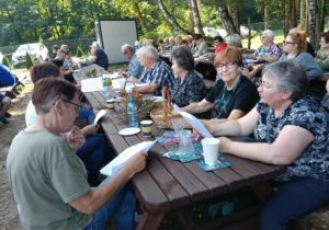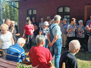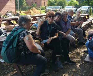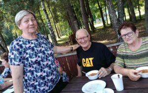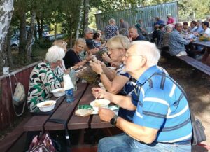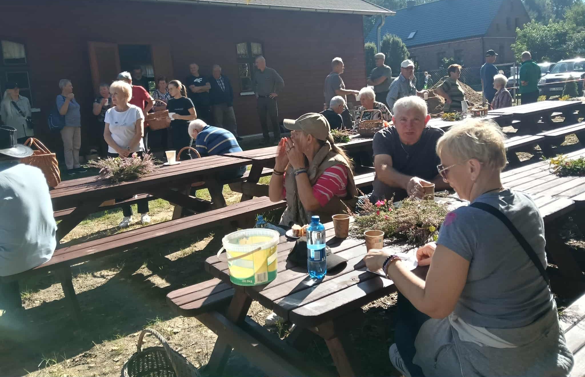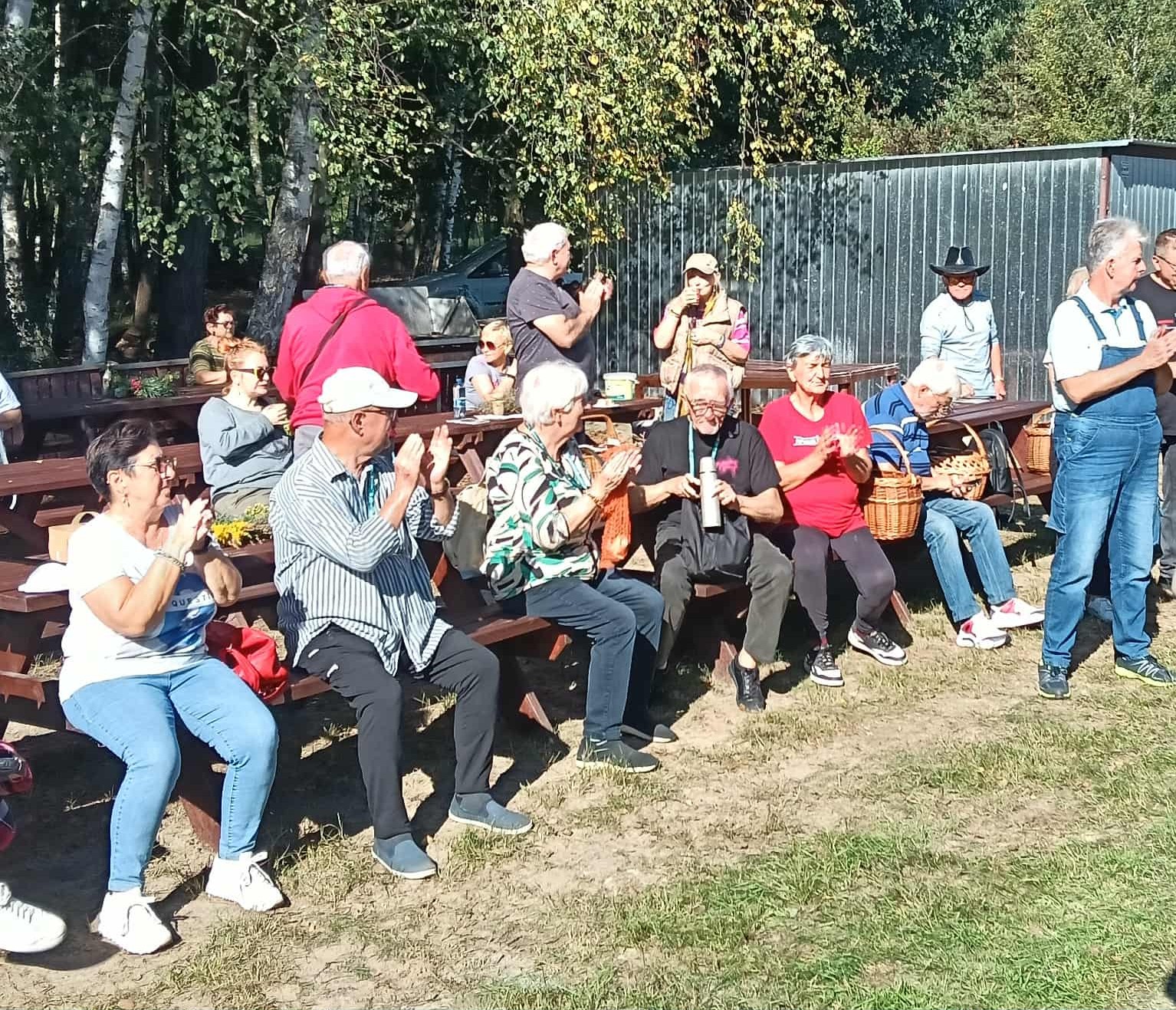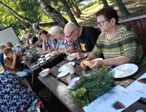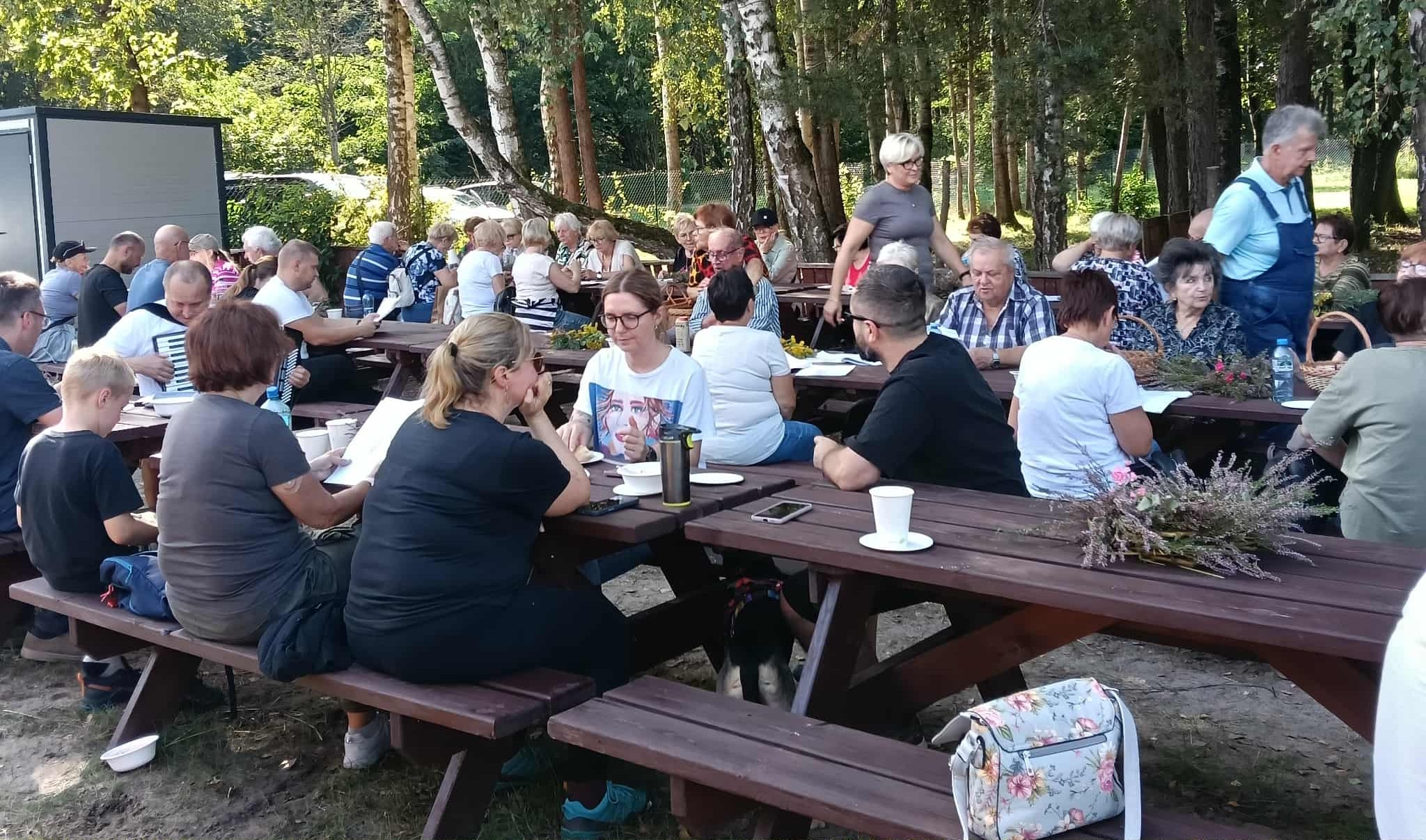 Po powrocie z lasu uczestnicy zasiedli do wspólnego biesiadowania. Spotkanie uświetnił akompaniament akordeonu w wykonaniu Dawida Krupy. Seniorzy chętnie dzielili się wspomnieniami z młodości oraz refleksjami na temat zmian zachodzących w lokalnym krajobrazie i społecznościjakie przyniosły ostatnie lata.