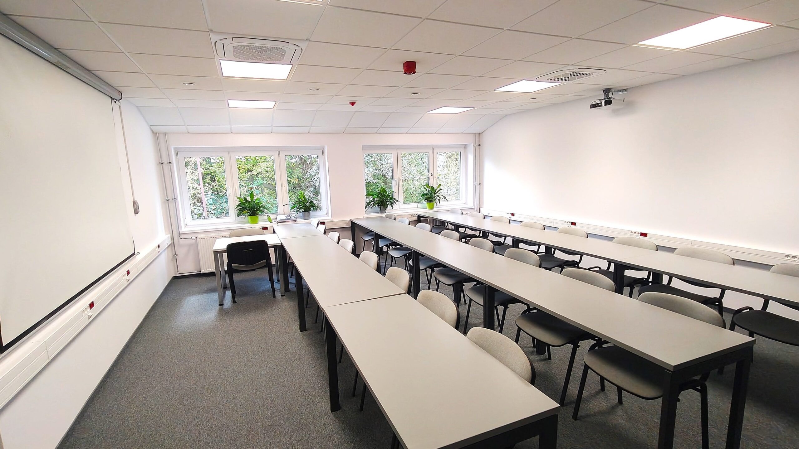 Nowoczesna sala szkoleniowo-dydaktyczna wyposażona w niezbędny sprzęt projekcyjny oraz nagłośnienie.