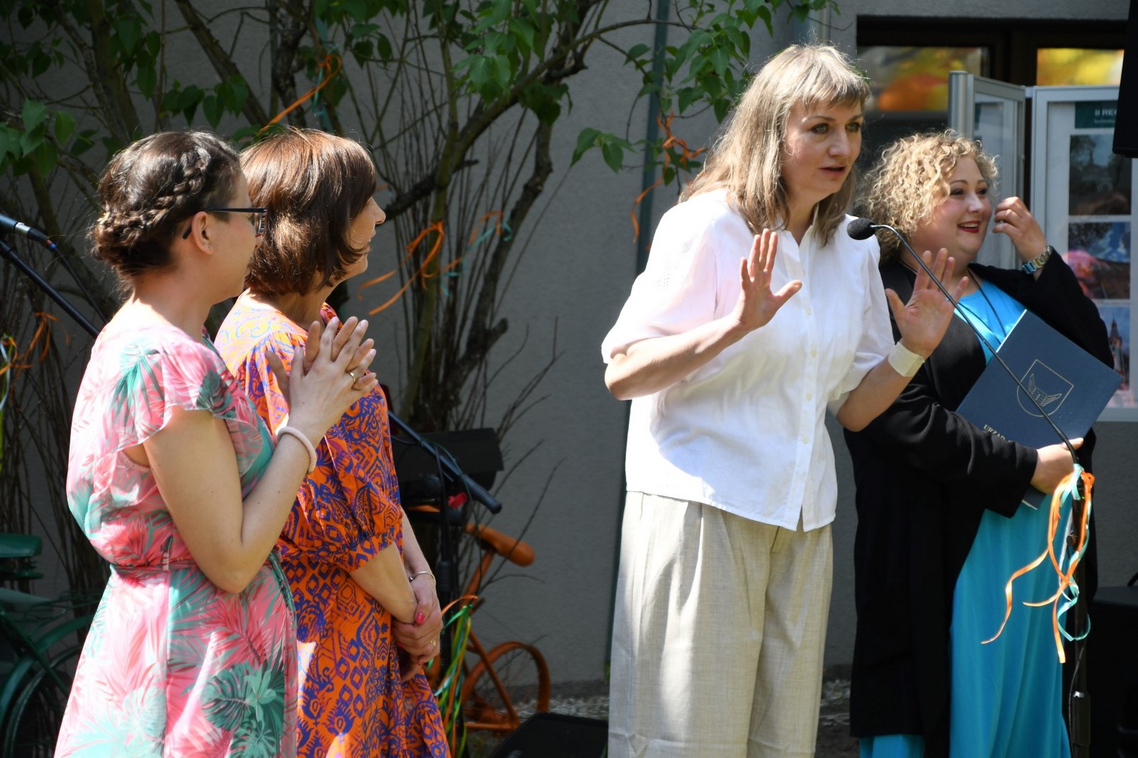 Panie: Elżbieta Podlaszewska- Cybal, dyrektor biblioteki wraz z Grażyną Pogonowską- zastępcą burmistrza, Marzeną Matusiak – kierownikiem Wydziału Komunikacji Społecznej w Starostwie Powiatowym oraz mieszkanką Nowego Tomyśla, symbolicznie rozwiązały wstęgę, by zaprosić zgromadzonych do „Bibli(o)grodu”.