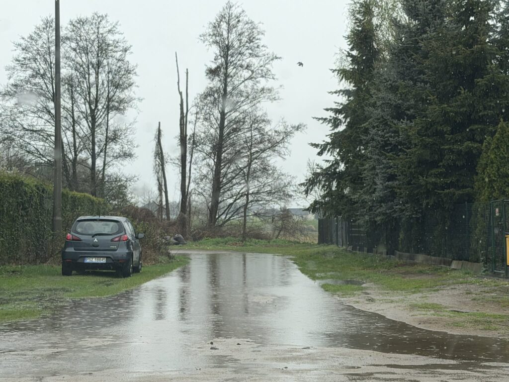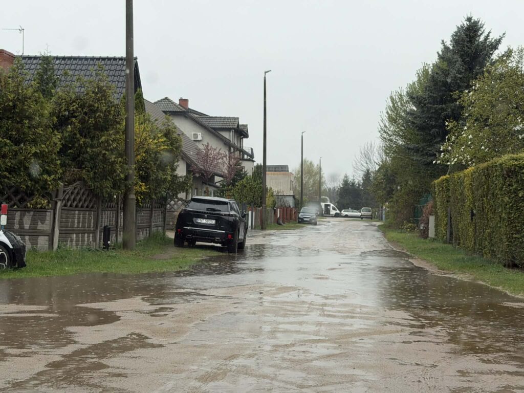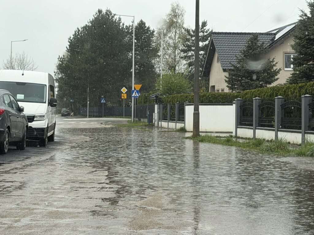 Na zdjęciach ulica Piaskowa podczas poniedziałkowych opadów deszczu (20.04.2026 r.)