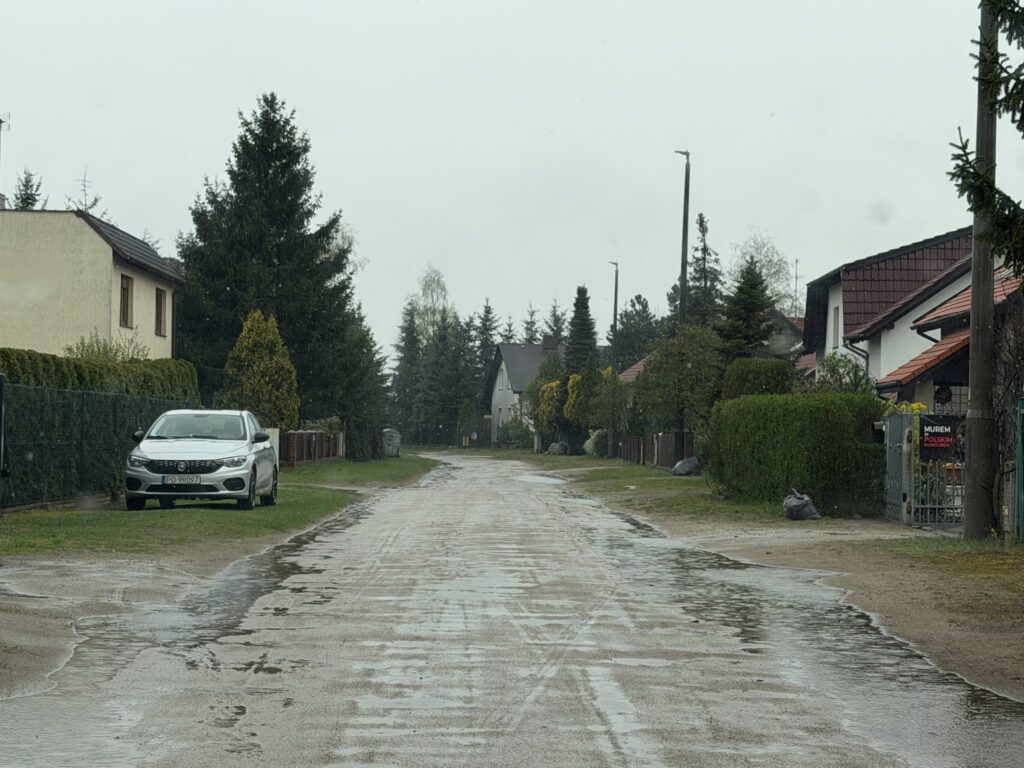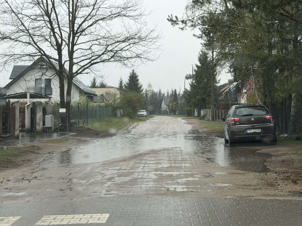 Gdy nie pada – to bardzo się kurzy, bo luźny piasek szybko unosi się pokrywając wszystko wokół. Do tego dziura na dziurze, nierówna nawierzchnia… Mieszkańcy od lat proszą o przebudowę drogi, jej utwardzenie, aby wreszcie żyć normalnie.