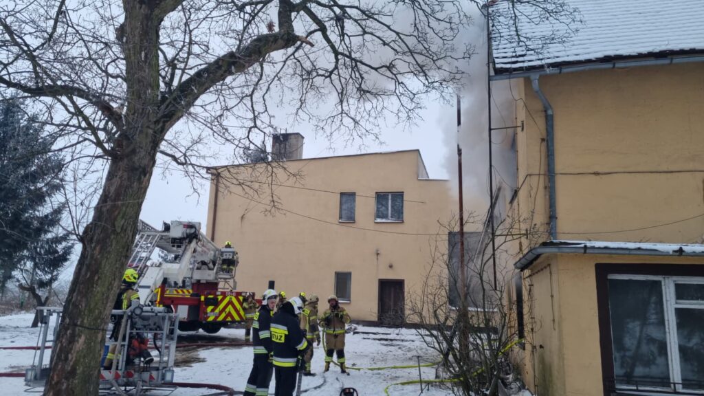 Po dojeździe na miejsce zdarzenia stwierdzono silne zadymienie budynku jednorodzinnego, wynikające z pożaru ukrytego, który rozprzestrzeniał się w drewnianych elementach stropu oraz w wielowarstwowych ścianach budynku. Brak osób poszkodowanych.