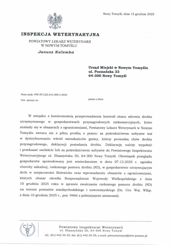 W związku z koniecznością przeprowadzenia kontroli stanu zdrowia drobiu utrzymywanego w gospodarstwach przyzagrodowych niekomercyjnych, które znalazły się w obszarach z ograniczeniami, Powiatowy Lekarz Weterynarii w Nowym Tomyślu zwraca się z pilną prośbą o pomoc za pośrednictwem sołtysów wsi w dystrybuowaniu wśród mieszkańców gminy, którzy prowadzą chów drobiu przyzagrodowego, deklaracji posiadania drobiu.
