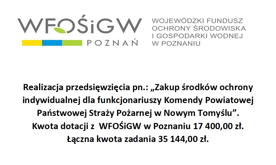 Realizacja przedsięwzięcia pn.: „Zakup środków ochrony indywidualnej dla funkcjonariuszy Komendy Powiatowej Państwowej Straży Pożarnej w Nowym Tomyślu”.
